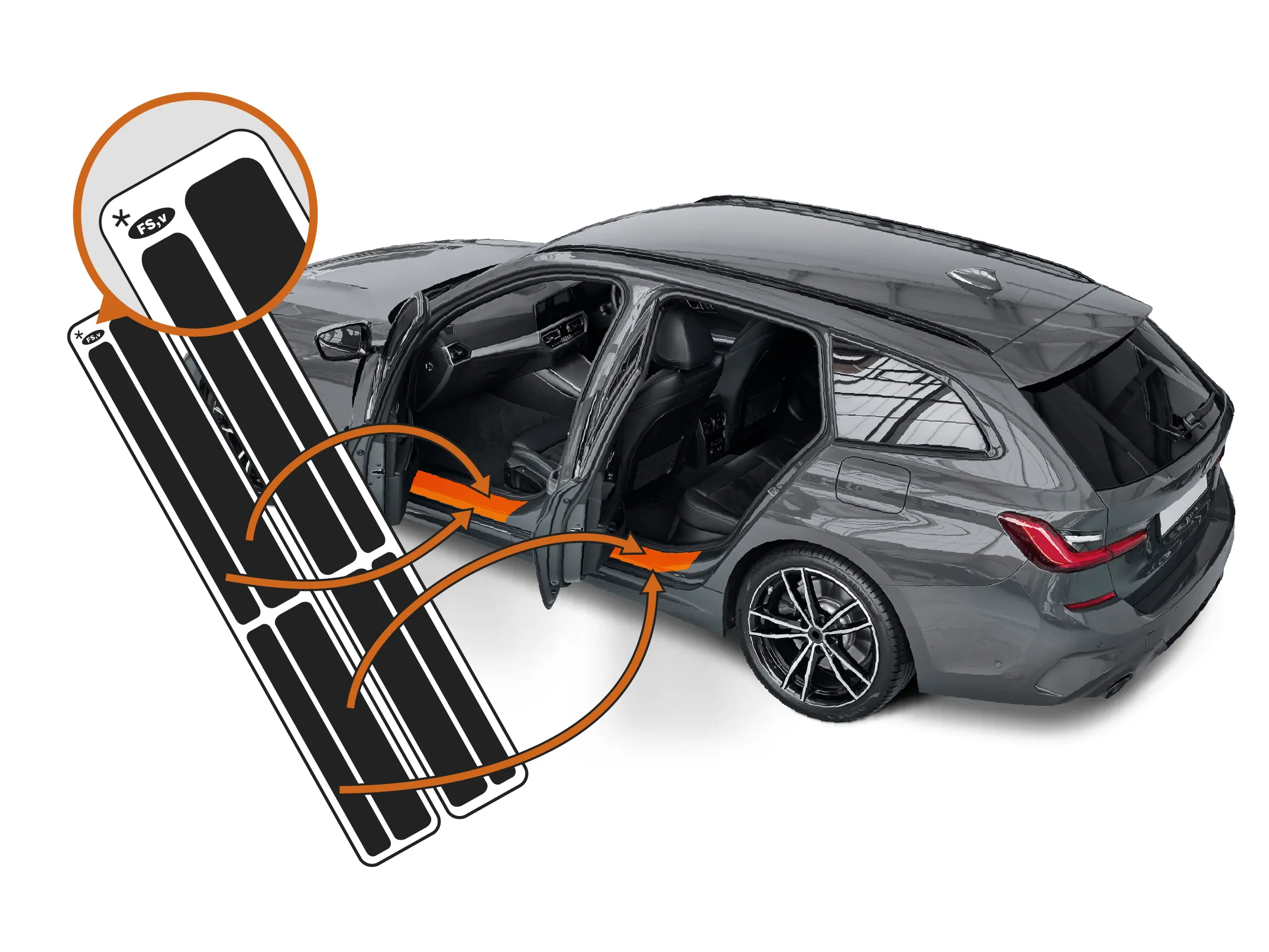 Die Montage der Einstiegsleistenschutzfolie erfolgt genau wie in unserer allgemeinen Montageanleitung beschrieben. Bitte beachten Sie für die korrekte Zuordnung der Einstiegsleistenschutzfolie: Auf dem Folienbogen für die Fahrerseite ist stets eine Kennzeichnung angebracht (FS / FS,v = Fahrerseite vorn). Die Anordnung der Folien entspricht der Draufsicht Ihres Fahrzeuges - d.h. der Folienbogen mit Kennzeichnung (FS / FS,v) wird auf der Fahrerseite angebracht. Der andere Folienbogen wird in der gleichen Anordnung auf der Beifahrerseite montiert.